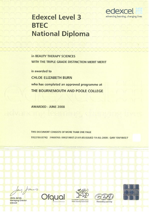 I completed a BTEC National Diploma in Applied Science Beauty Therapy at Bournemouth & Poole College before moving to Jersey in 2008 at the age of 23 to begin working as a full-time therapist in the industry that I’ve always had an interest in and passion for.